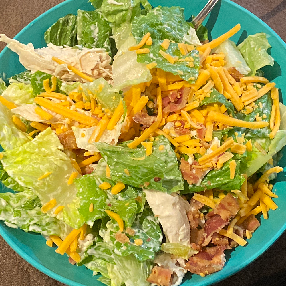Caesar salad with chicken, cheddar and bacon