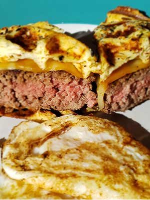Figure 13 Patty Melt on chaffles with fried eggs.