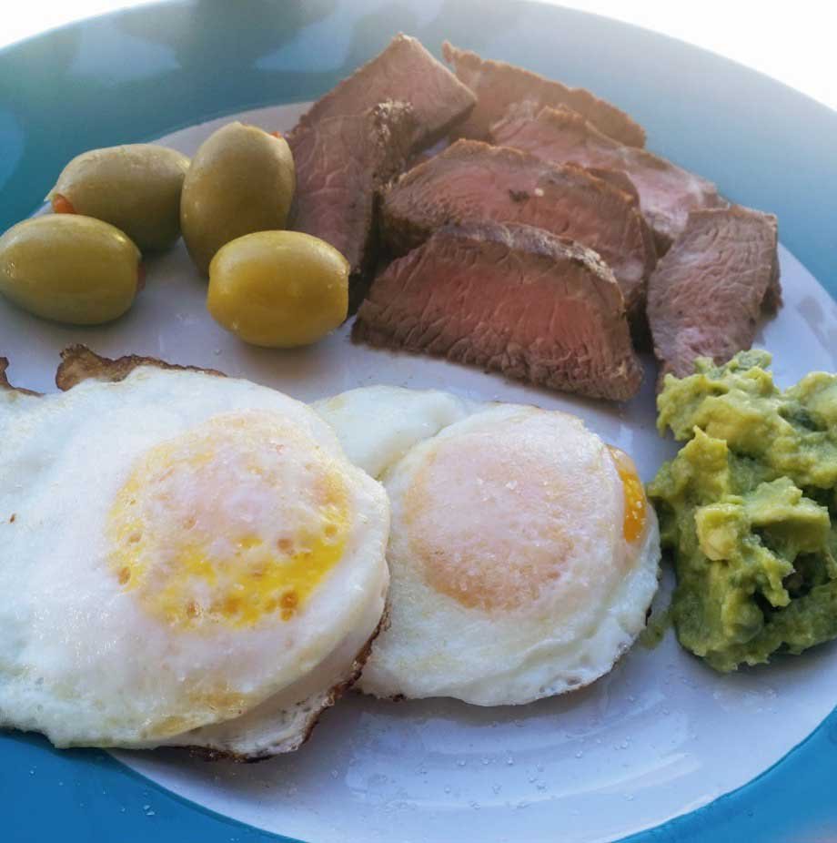 Figure 3 Steak and Eggs for breakfast with green olives and guacamole for healthy fats