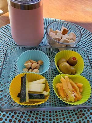 Figure 7 #parkdayfood macadamia nuts, zucchini strips, green olives, shredded cheese and cubed turkey. Green tea to drink
