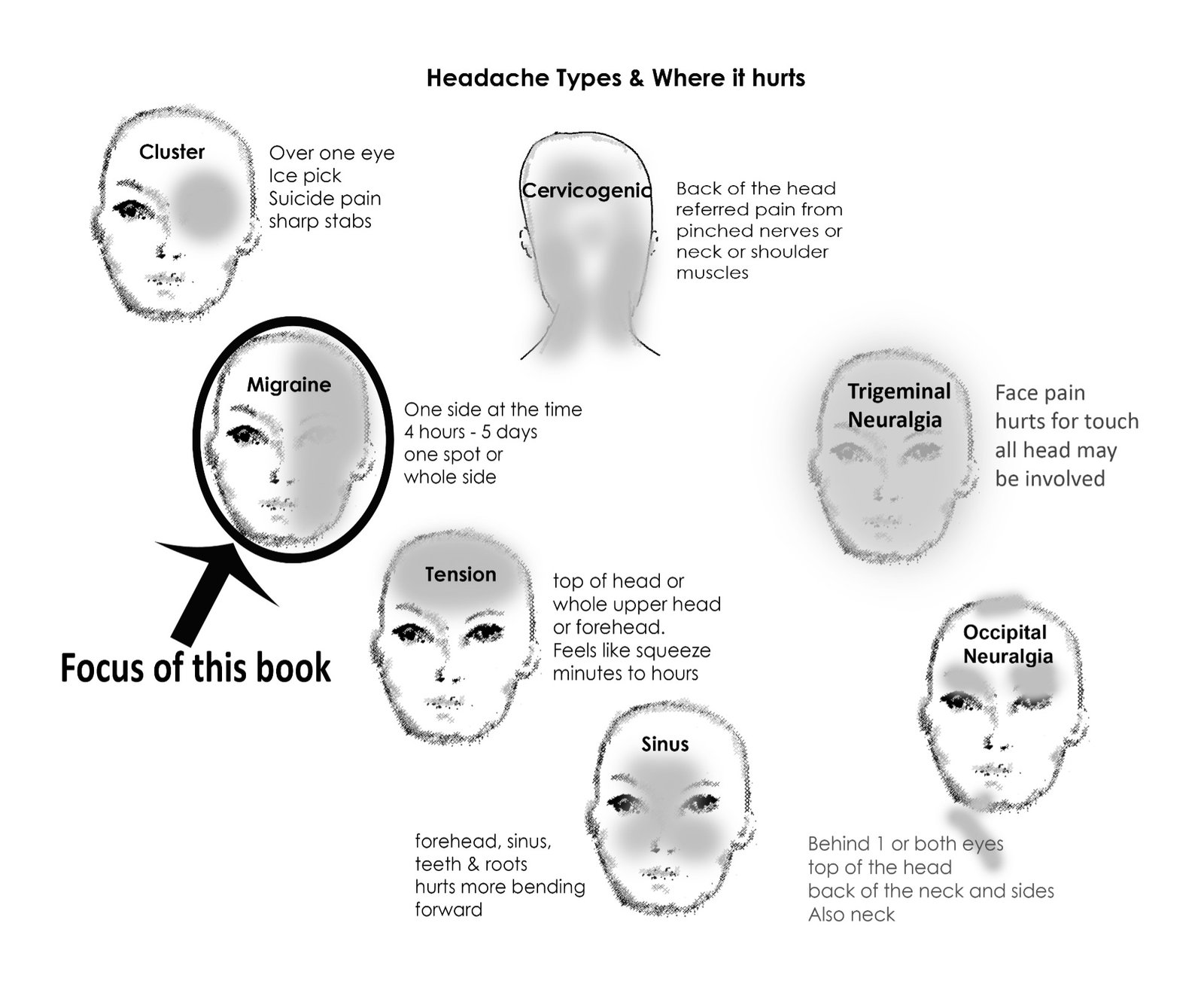 For example, if a migraineur loses speaking ability, it is the left side of the brain where a special region (Broca Area) is responsible, so we know where the problem is located. This lateralization and the pain sensory nociceptors on the meninges also mean that the pain is not only one sided (unilateral) but it is not a throbbing pain. These two points are quite in contrast to most medical definitions of migraine. Below you see a diagram taken from my book that shows various headache types. The one I circled is migraine headache.