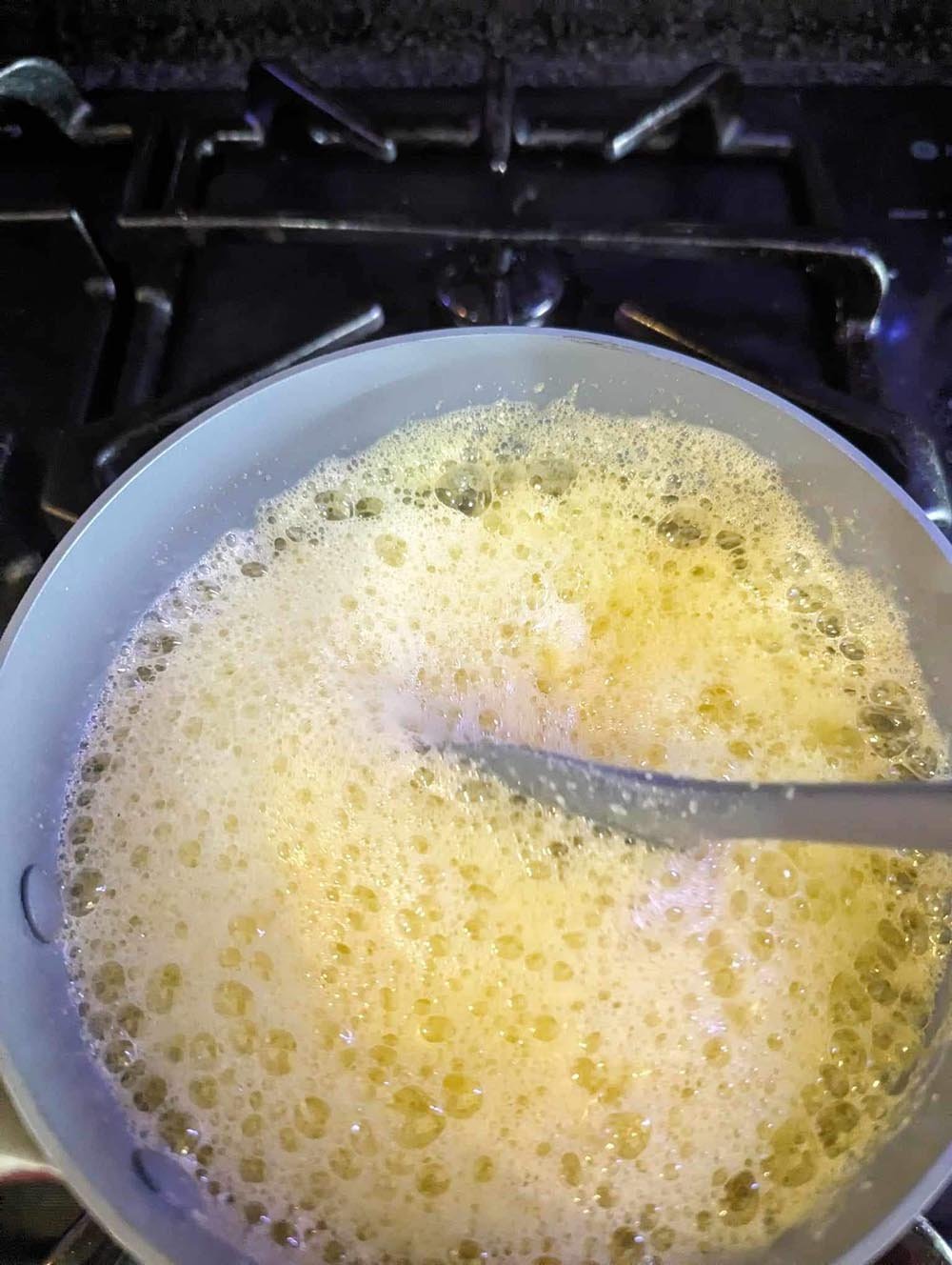 - Once the butter is melted, continue to cook it, stirring occasionally. The butter will go through several stages: foaming, bubbling, and then finally, it will start to turn a golden brown color. This process usually takes about 5-8 minutes. Be vigilant as it can turn from browned to burnt quickly.