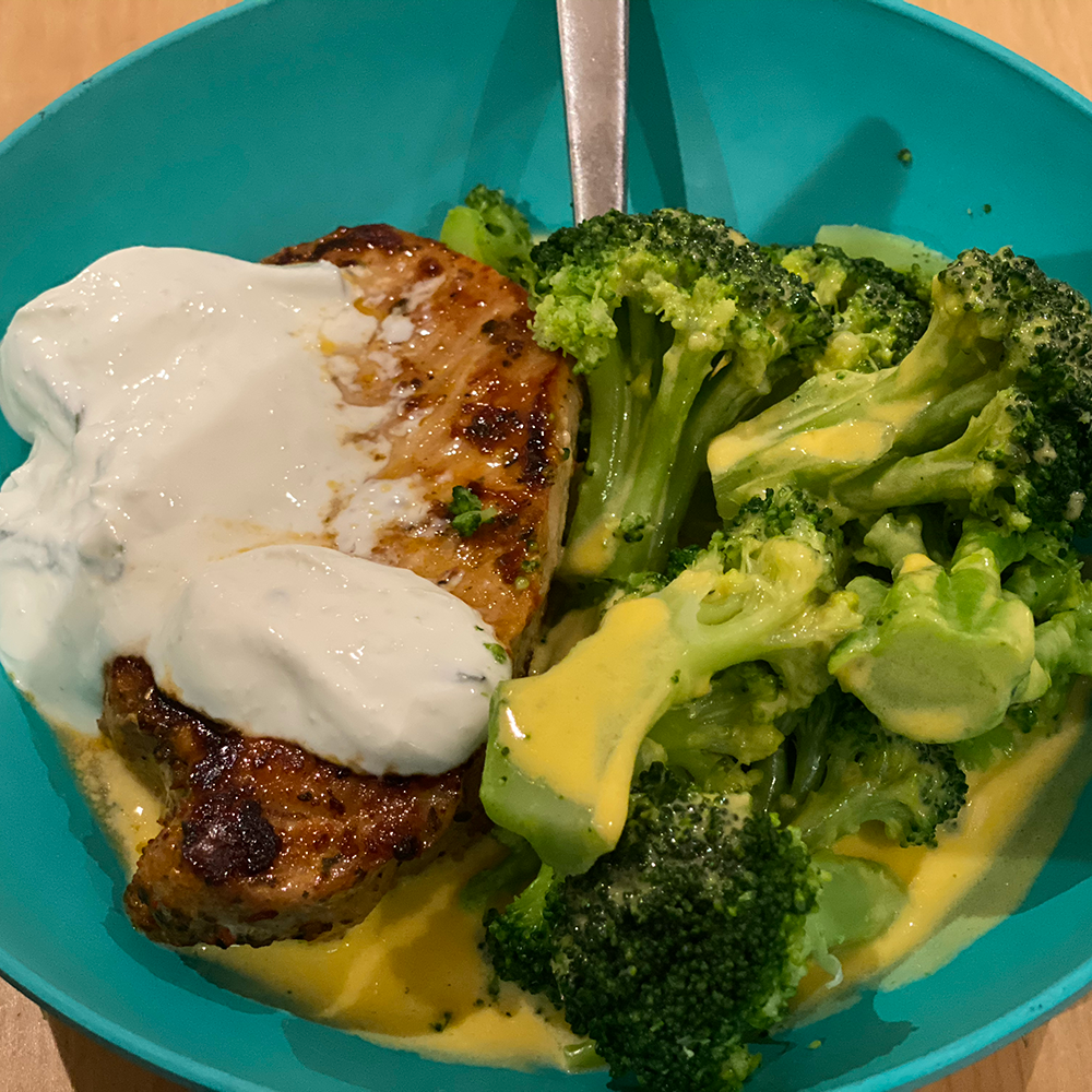 Pork chops with broccoli, cheddar sauce and sour cream