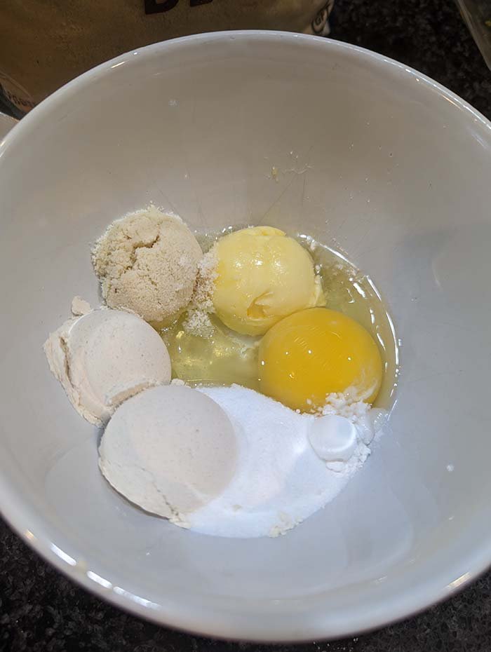 Melt the butter before adding to the bowl. 1T almond flour, 1T butter, 2T Keto Chow, 2T allulose, 1/4t baking powder, 1 egg.
