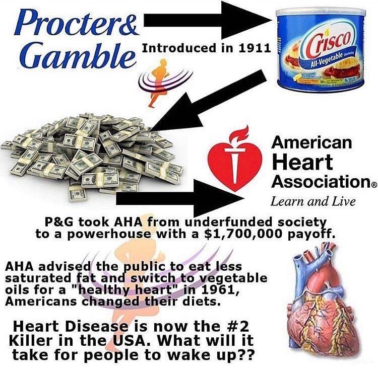 In the 1940s, the American heart Association received a $1.5M donation from P&G and "coincidentally" endorsed vegetable oils as a heart healthy alternative to traditional animal fat.