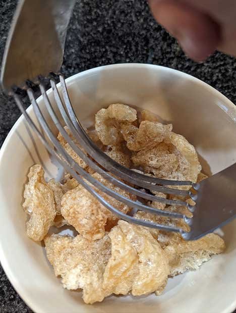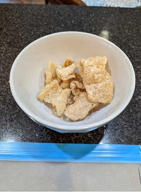 Crush your pork rinds first. I like to use a pastry cutter in a bowl or put it in silicone reusable storage containers and crush it underfoot or with a rolling pin. The 4-year-old grandson loves this step.