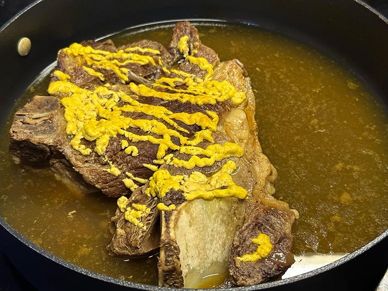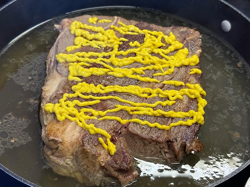 - Cover the top with mustard and add 3 cups of hot water. Cover with a tight lid and transfer to the oven. Bake at 350°F (175°C) for 2.5 hrs.