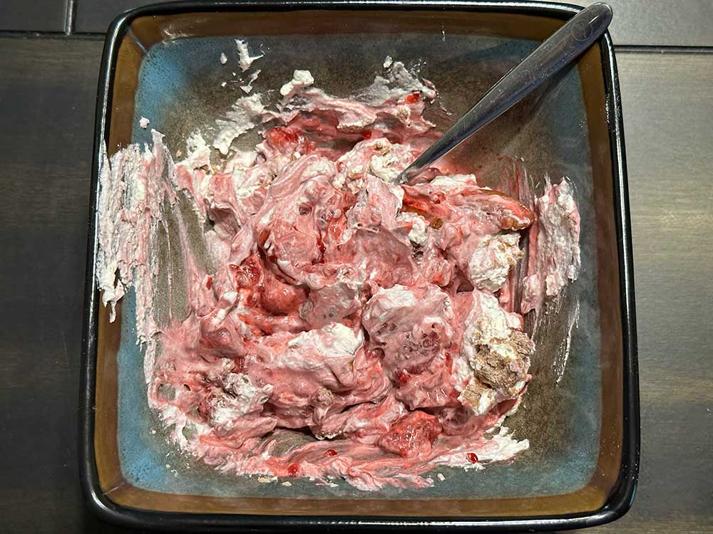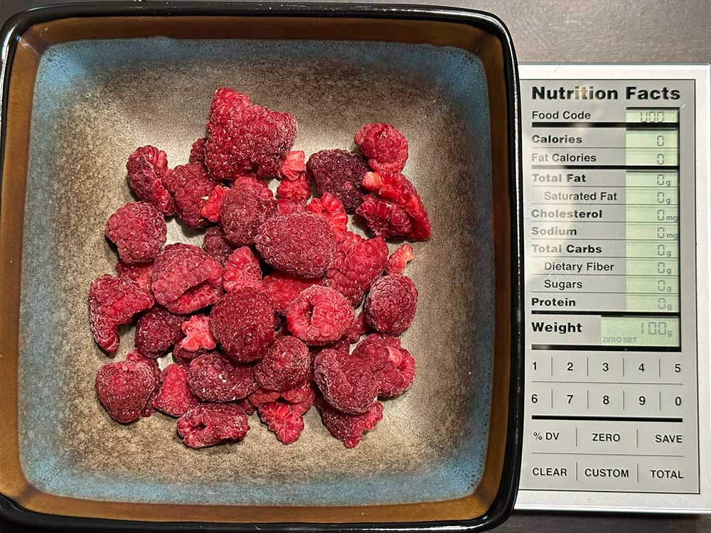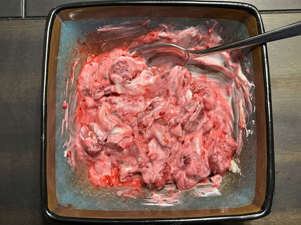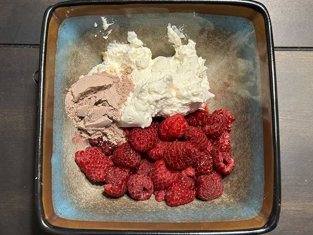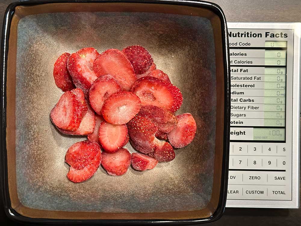 Start by measuring out 100 g (3.5 oz) of frozen strawberries or raspberries. Let them thaw to your desired level of frozen-ness. I like them best when they are still a little frozen. When I am in a hurry, I speed the process up in the microwave.