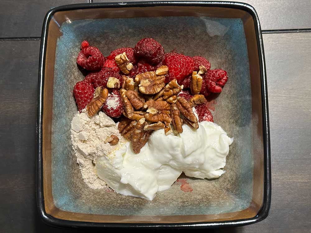 Moving on to the third dessert, we have a raspberry pecan yogurt dessert. This one is a bit more filling, thanks to the addition of Greek yogurt.