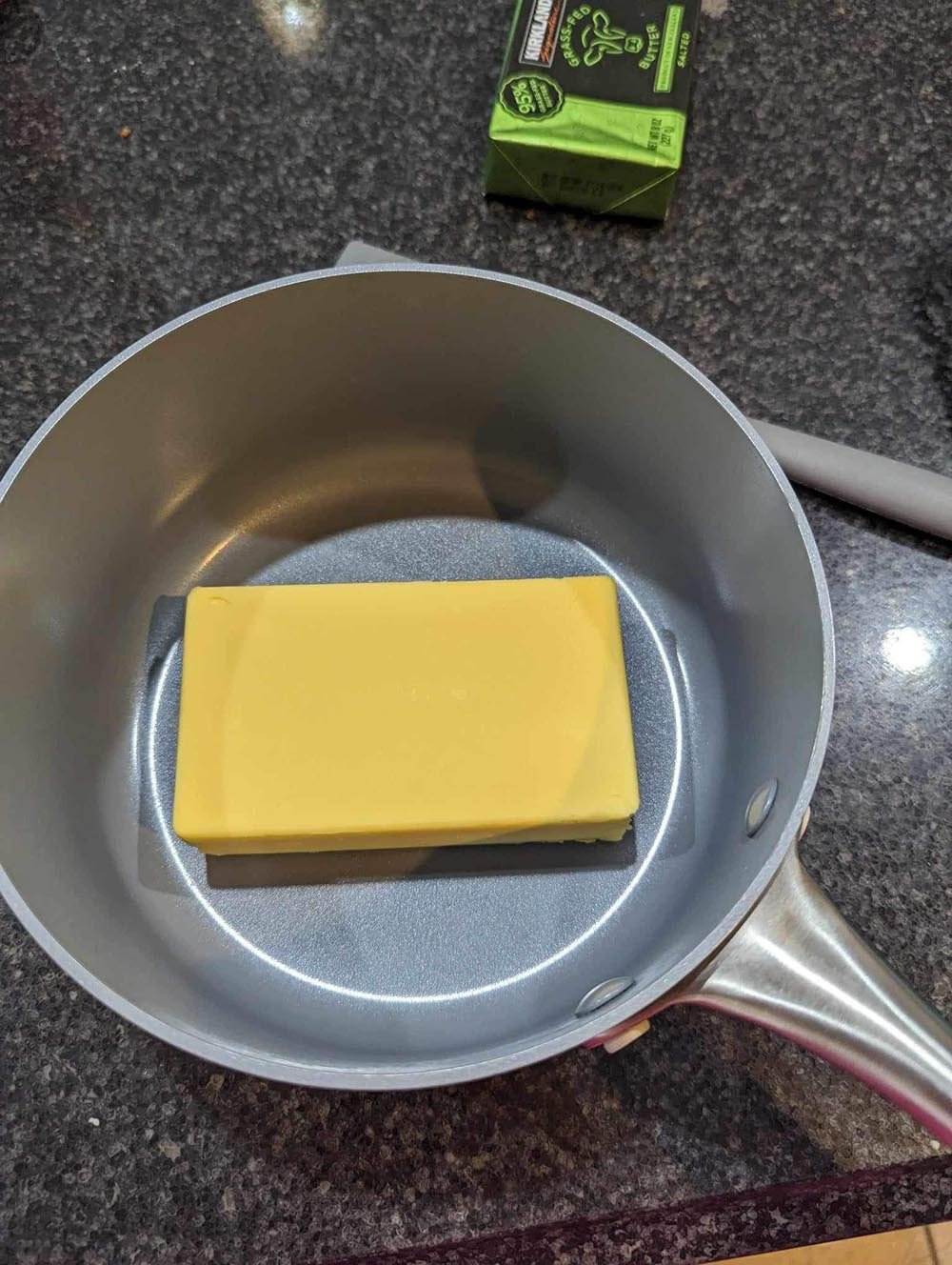 - Cut the unsalted butter into tablespoon-sized pieces and place them in a light-colored saucepan. A light-colored pan makes it easier to see the color change in the butter.
