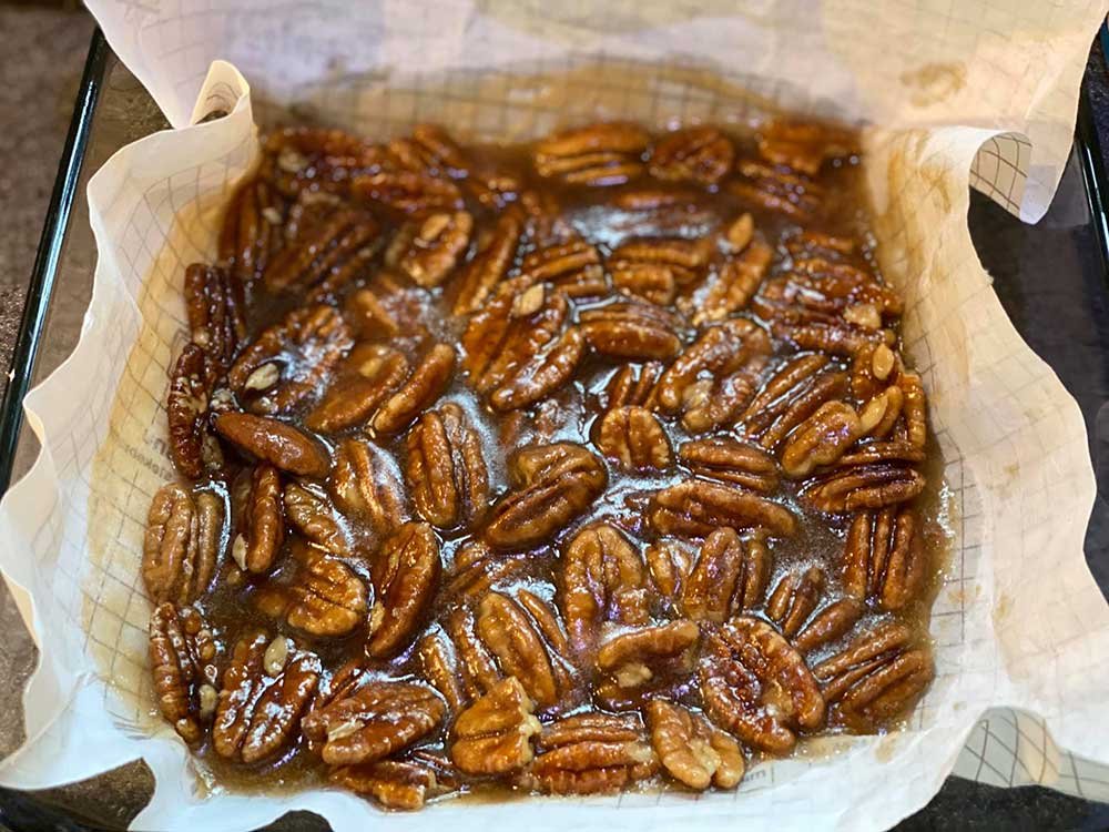 - Combine with Pecans: Add toasted pecans to the caramel mixture. Stir to coat the pecans evenly.