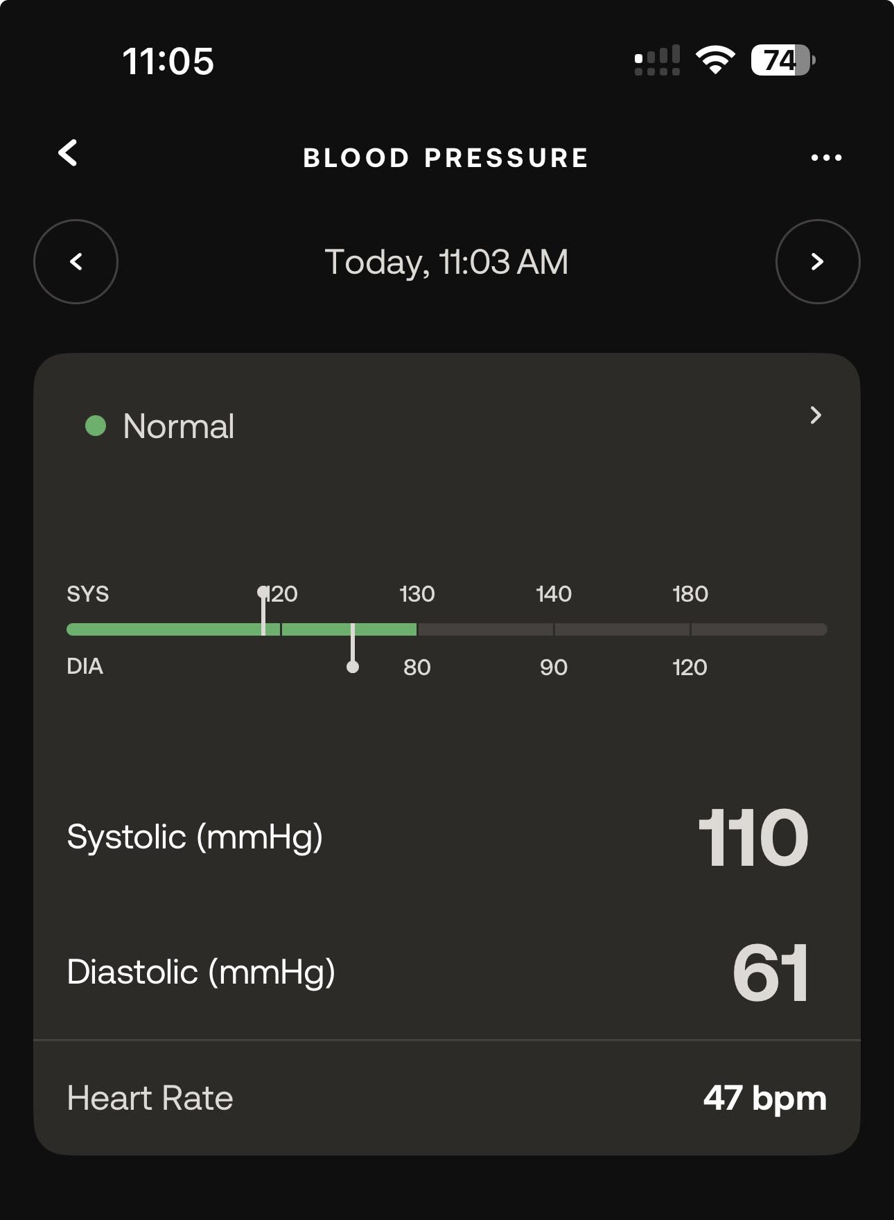 Blood pressure went to my normal lower range again. After a 4-month work trip overseas, it had crept up quite a bit. Not high, but elevated. Check out these numbers now. Images courtesy of the Withings app and the Withings Blood Pressure Monitor. A quick note on the monitor: it measures while inflating, so it does not cut off your arm first to then painfully slowly release the pressure. This is quite a relief for people with lipedema like myself.