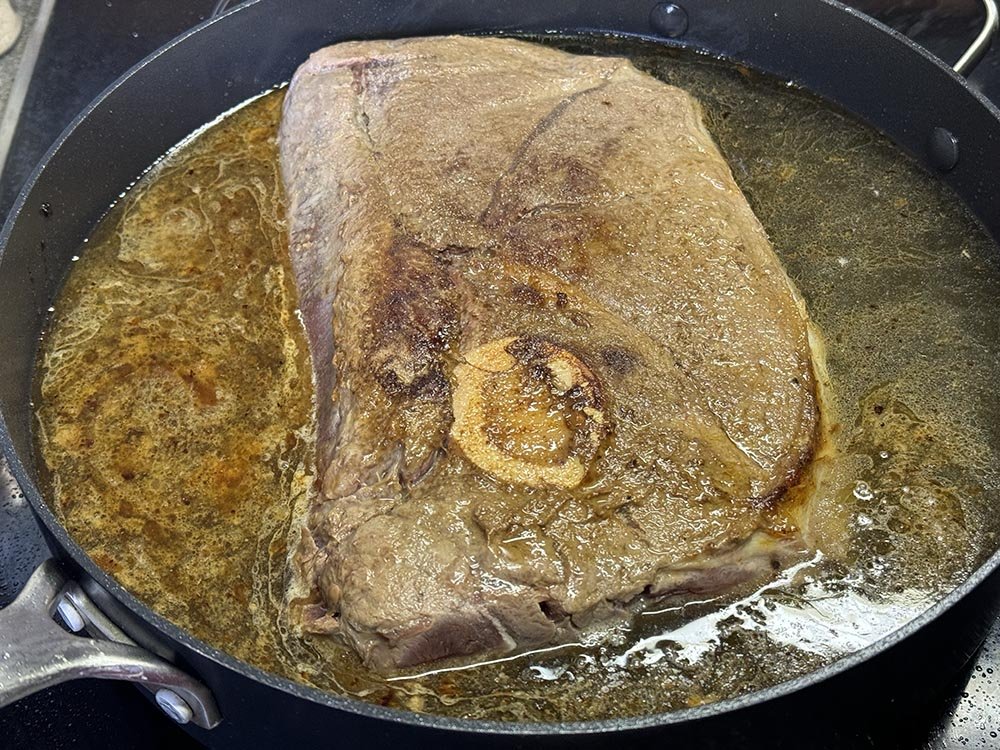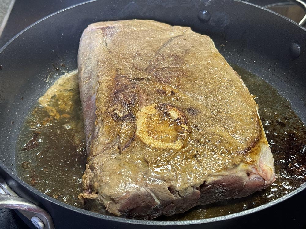 I am not a cook, but this is an easy recipe. I seared it in beef tallow, added salt, and then stuck it in the oven after filling up the pan with water (about half), and baked it for 3 hours at 350 degrees. The meat basically fell apart without being dry. It was delicious, and I have plenty of leftovers.